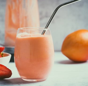 Šis kokteilis yra mano pats mėgstamiausias. Puikiai tika ir kaip sveikesnis desertas, ir kaip greiti be galo gardūs pusryčiai. Mangai ir kokosų pienas suteikia kremiškumo, o braškės – gaivos.